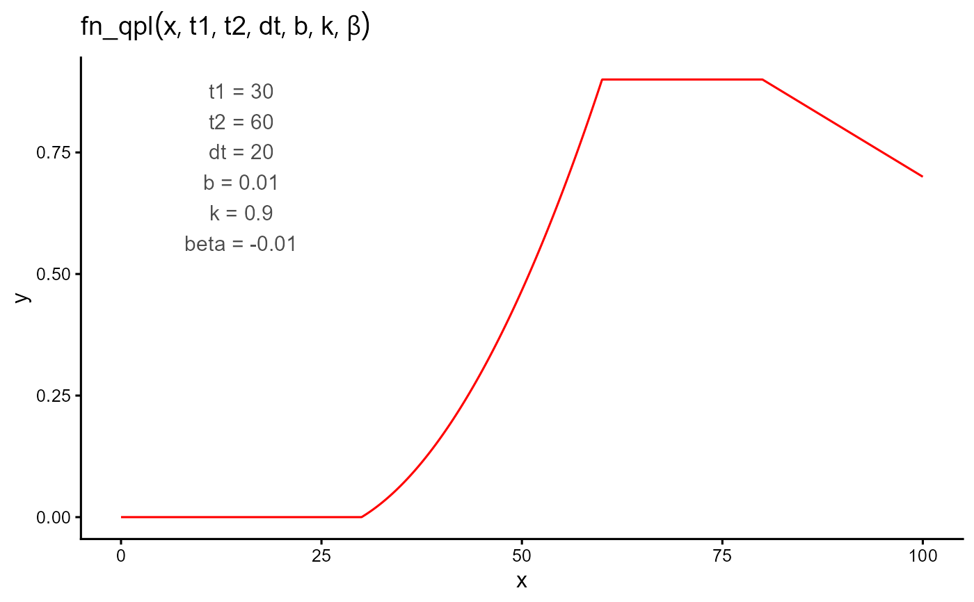 $$ f(t; t_1, t_2, dt, b, k, \beta) = \begin{cases} 0 & \text{if } t < t_1 \\ b(t - t_1) + c(t - t_1)^2 & \text{if } t_1 \le t \le t_2 \\ k & \text{if } t_2 < t \le t_3 \\ k + \beta (t - t_3) & \text{if } t > t_3 \end{cases} $$