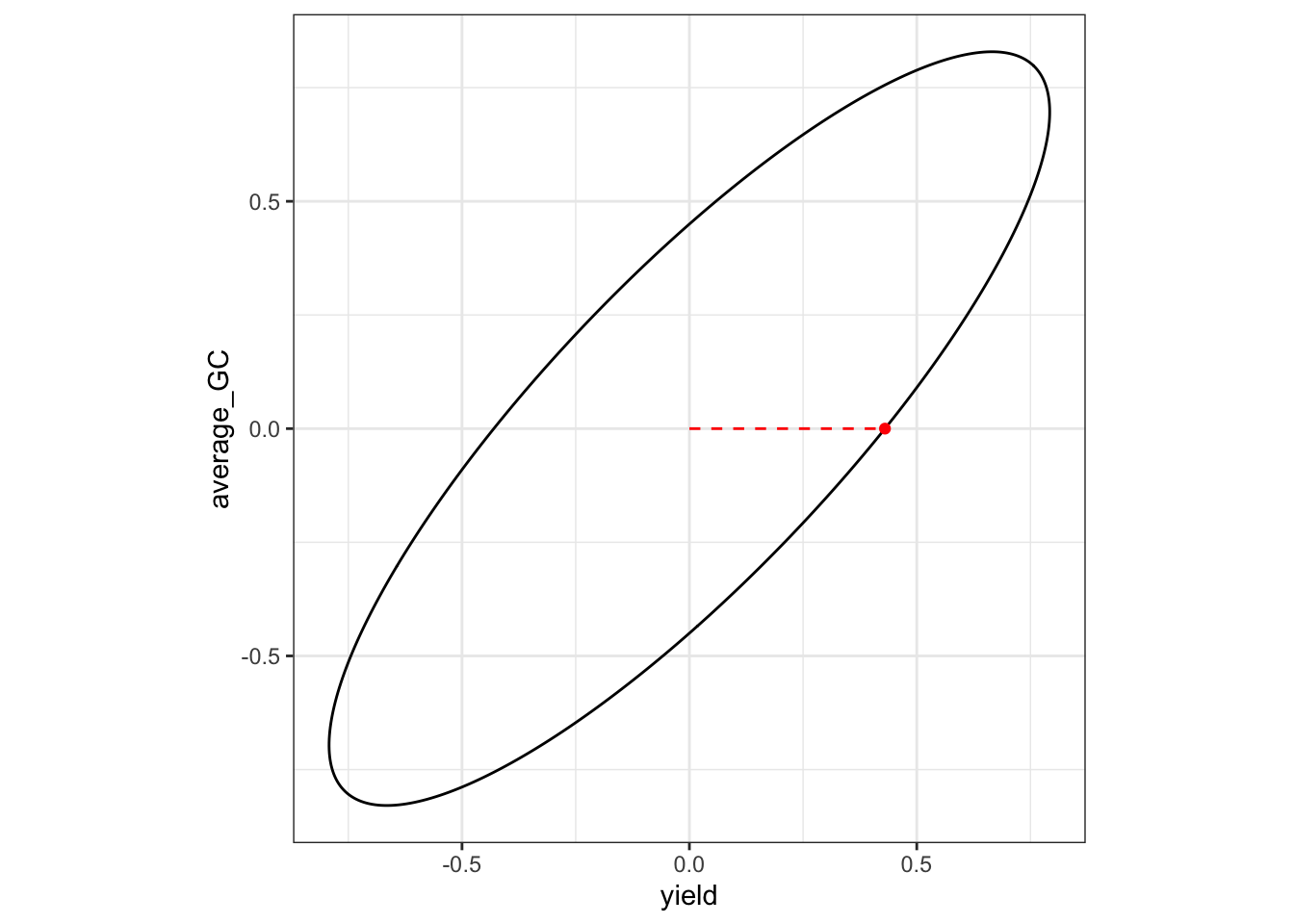 In he equation above \(\mathbf{Q} = \mathbf{H} \mathbf{\Gamma}^{-1} \mathbf{P} \mathbf{\Gamma}^{-1} \mathbf{H}\) represents the matrix representation of an ellipsoide (high dimensional ellipse) in \(t\) dimensions. The shape and surface of the ellipse (if only 2 traits are considered) is determined by the intensity of selection, the correlation between traits, the heritability and the accuracy of each one of them.