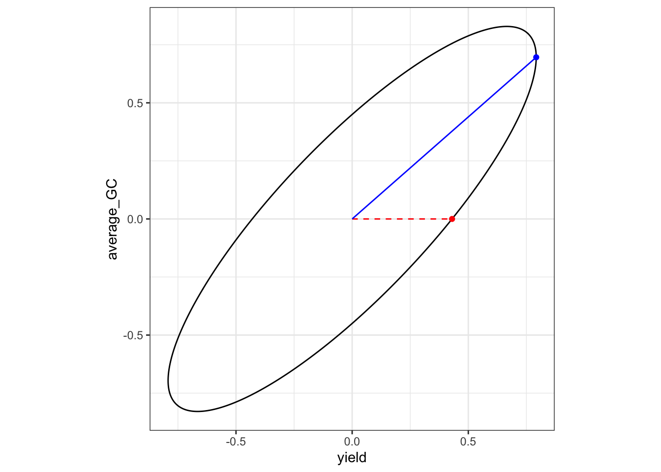 Visually, the dashed red line shows the direction of the merit vector, while the blue line segment is the projection of the point on the ellipsoid that maximizes genetic merit.
