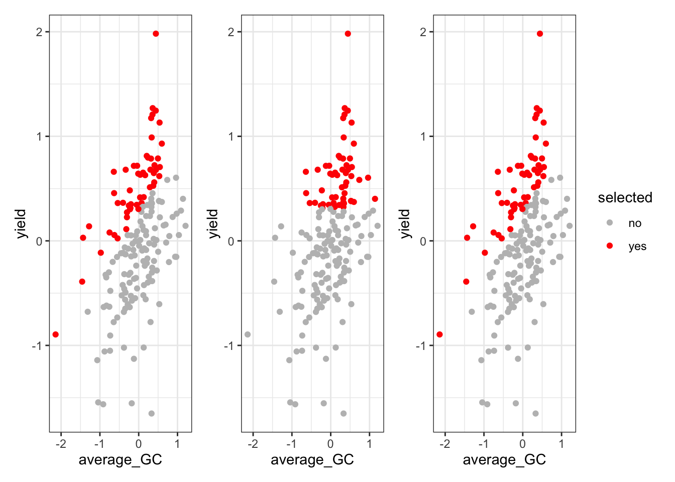 p2 <- ggplot(df_merit, aes(x = average_GC, y = yield, color = selected)) +